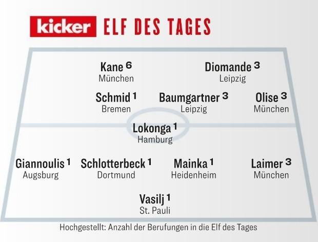 本周一,《踢球者》公布了他們評選的德甲第13輪比賽最佳陣容,其中凱恩、奧利塞、施洛特貝克、萊默爾等人在列。